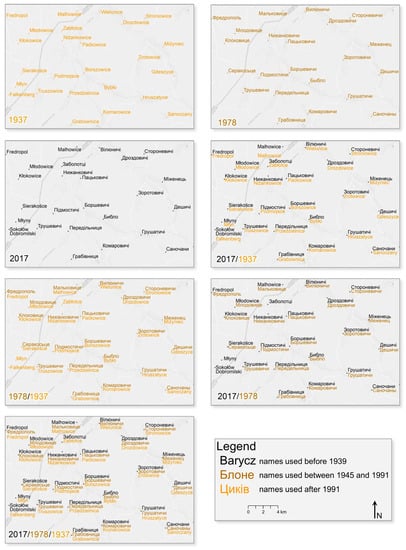 Comparative and empirical research methods were used in order to develop rules for the changeability of names. Comparative methods were used to compare places in different time periods. The aim of the comparative studies was to determine similar or identical characteristics and features that distinguish the compared names (other than those resulting from the change of language). According to the comparative method rule, “not to compare too many features at once”, the number of compared name forms was limited to three languages and three time periods. Names were treated as dependent variables, which can be changed into other language on the basis of phonetics or letter spelling. Some of the names can be independent variables when they are changed into a completely different form. The starting point of the research were Polish pre-war names, as they were used in the whole testing area and they were in the native language of the authors. First, the Russian names were compared in relation to Polish ones. Then, Ukrainian names were checked in relation to Russian ones. Some limitations of the comparison have also been defined, mainly for places that do not occur on some maps. The main area of focus were the directions of changes, i.e., the classification of the changeability rules into main groups rather than defining detailed rules for each specific change.