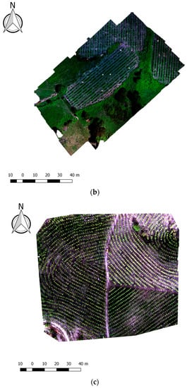 Three study cases were considered: an orthomosaic from an olive crop acquired with an UAV imagery with 2.75 ha (Mirandela, Bragança, Portugal in August 2016, 41°37′18.895′′ N; 7°10′20.182′′ W), another from a eucalypt crop with 0.77 ha (Chamusca, Santarém, Portugal in December 2016, 39°20′39.686′′ N; 8°23′28.989′′ W) and the last one considered was from a vineyard crop with 1.57 ha (Corvo, Fafe, Portugal in May 2017, 41°31′03.124′′ N; 8°13′00.997′′ W). In Figure 1 are presented the three orthomosaics that are considered in this work.