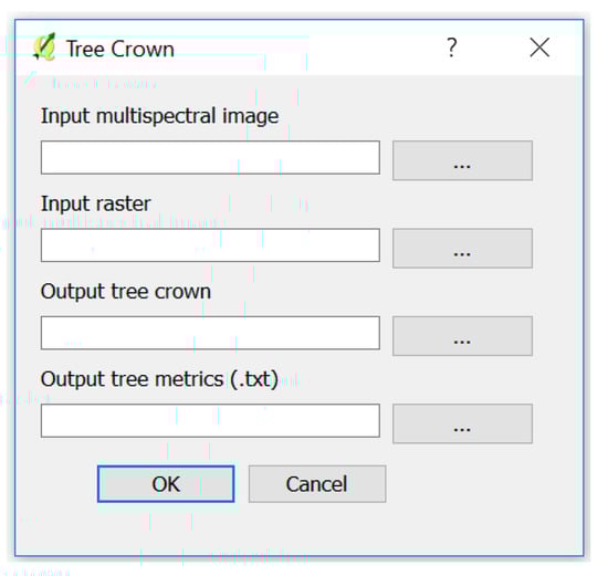 The main graphic interface is a window composed by four fields, two inputs and two outputs (Figure 2). This fields were defined as push buttons and line edits. The functions related to each push button are, respectively, inputfile, inputfile2, output, and output2. The main procedure was implemented in the function run. In this function the image details, such as extension, number of bands and multispectral bands, were accessed using functions from QgsRasterLayer() class [38]. In order to access to Processing Toolbox algorithms, the Processing module was imported and the function runAlgorithm() was used. The experimental procedure performed allowed to select the most accurate methodology to be implemented in the plugin. The methodology implementation is described in the Section 3.2.1, Section 3.2.2, and Section 3.2.3.