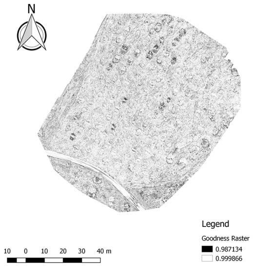 The segmentation accuracy was evaluated based on “Goodness for fit” statistical model, as provided by i.segment algorithm, which allows for describing how well it fits a set of observations, summarizing the discrepancy between observed and expected values. In the GRASS library (i.segment algorithm), this parameter is based on the distance of the pixel to the object that it belongs to. A value of 1 means identical values, a perfect fit, and a value of 0 means maximum possible distance, worst possible fit. Given the lack of field data to validate the results obtained, this model was used. In order to estimate the percentage of pixels with specific values, r.report (algorithm from GRASS) was computed. The model was applied to the segmentation tests that were performed in Table 1. Based on the report that was returned it was concluded that: in case (a) all of the image pixels were above 0.96 and 47.33% of them were above 0.99; in case (b) all of the pixels were above 0.94 and 69.82% of the pixels were above 0.99; in the case (c) all the pixels were above 0.95 and 44.85% of them were above 0.99; in case (d) all the pixels were above 0.93 and 73.79% of them were above 0.99; in case (e) all the pixels were above 0.95 and 44.85% were; in case (f) all the pixels were above 0.97 and 64.94% of them were above 0.99. The values obtained proved that the segmentation using i.segment algorithm was satisfactory. Figure 4 presents an example of “Goodness for fit” map.