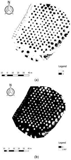The final result was obtained from a segmentation through i.segment algorithm using the multispectral image with separated bands, followed by an unsupervised classification through Unsupervised kmeans image classification when considering the NDVI image as input (Figure 5a).