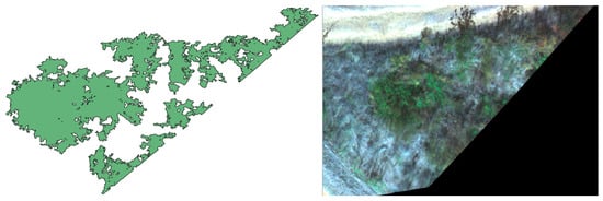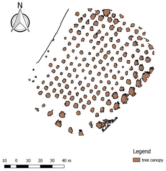 The fractal analysis was applied in order to obtain the tree crown parameters and metrics in shapefile format. To perform this, the resulting image from OBIA need to be converted to binary image, where 1 corresponded to the tree crown and 0 to the remaining objects. The resulted image was then converted to shapefile through Polygonize, algorithm from Geospatial Data Abstraction Library (GDAL) [45]. The area was estimated, and the tree crown objects were identified when considering an area between 1 m2 and 50 m2.