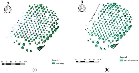 To test the plugin created, the study case presented in the experimental procedure was considered. The result obtained was the shapefile with the tree crown and the text file with the metrics estimated. Figure 7a,b present the resulting shapefile from plugin and the shapefile obtained manually, respectively.