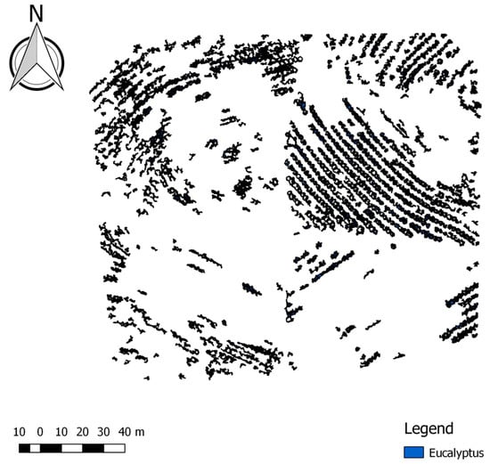 Two different crops were also used to test the plugin, eucalyptus, and vineyards. In the case of eucalyptus, the resulted shapefile was not satisfactory, because most of the trees were not recognized and some shadows were identified as trees (Figure 11).