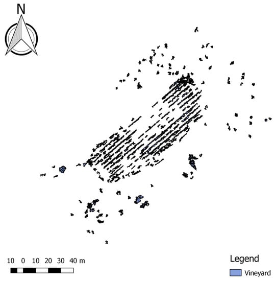 In vineyard crop study case, some species vegetation and other trees, different from vineyard, were identified. In this case, 254 trees were identified and 886.3 m2 of area was obtained. The mean distance was 13.3 m and 41 trees were missing (Figure 12).