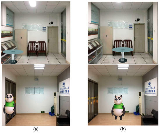 We selected four indoor scenes and trained their reference images in the server side. The AR-GIS visualization results are illustrated in Figure 8. In our example, we tracked the target scene and rendered it as a 3D model using two AR systems. The first column figures only use the ARToolKit system, which lacks 3D indoor scene understanding (Figure 8a). Unlike Figure 8a, the second column 3D models in Figure 8b were rendered in more rational positions, using the proposed AR system that does incorporate 3D indoor scene understanding.