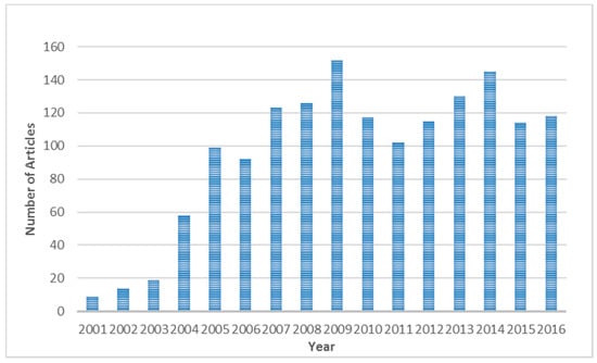 The number of articles published on geographic information ontology from 2001 to 2016.