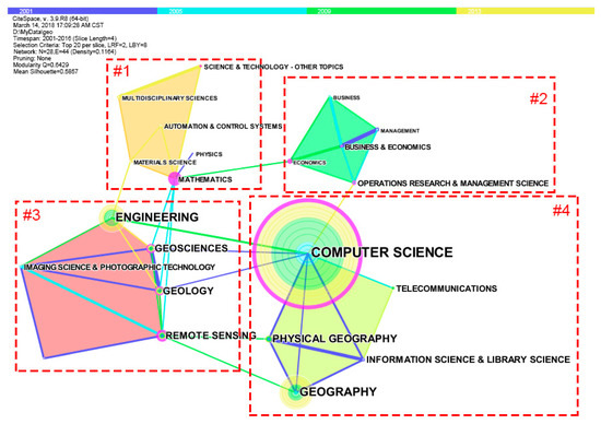 To study the relationships among subjects regarding the study of geographic information ontology and their evolution, the CiteSpace software was used to perform a co-occurrence network cluster analysis of these subjects [19]. The time span from 2001 to 2016 was divided into four equal sections, and 20 subject categories with the highest frequency of reference are selected for analysis from each section to draw the subject co-occurrence network cluster graph, which is shown in Figure 2 and includes 28 nodes and 44 co-occurrence links. In this figure, the colors of the bars at the top represent the year limits, and each node represents a subject category. The colors at the centers of the nodes represent the dates of the earliest appearance of the subjects, and the circular structures that encircle the nodes represent the history since each subject’s appearance. The colors of the circles correspond to those on the time color bar, and the thicknesses of the circles vary in direct proportion to the number of papers published within the time frame. The nodes with purplish-red apertures have high betweenness centrality (The betweenness centrality refers to the number of intermediate nodes that a node acts as the shortest path between the other two nodes. It is an index to measure the importance of a point in the network [19]), the links between nodes represent the co-occurrence relations between pairs of subjects, the thicknesses of the connecting lines are proportional to the number of co-occurrences of pairs of jointly appearing subjects, and the colors of the links correspond to the color of the time bar when both subjects occur together for the first time.