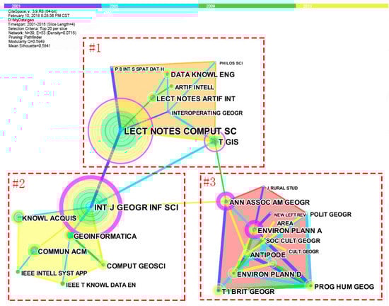 We divide the time from 2001 to 2016 into four periods. In each period, the top 20 journals cited with the greatest frequency by papers about geographic information ontology are selected for analysis, and the Pathfinder algorithm is used for pruning. Moreover, we have checked the corresponding cited documents for the cited journals in the network. If the citation rates of a journal in the network are high in only one or two articles, we will delete this journal information. After pruning, the network includes forty nodes that represent journals with the highest citation frequencies and fifty-four links representing co-citations. Next, on the basis of the topic, we perform a clustering analysis of the citing papers from the cited journals. The results are shown in Figure 3. This figure contains three obvious clusters. (a) In Cluster #1, the citing articles are mainly papers concerned with geographic information ontology and computers and include frontier terms such as “spatial”, “systems”, “modeling”, and “semantic”. (b) In Cluster #2, the citing articles primarily describe research into geographic information ontology and engineering and include frontier terms such as “knowledge acquisition”, “artificial intelligence”, “fuzzy”, and “flexible”. (c) Cluster #3 is the largest cluster and contains eleven journals, in which the citing articles focus on geographic information ontology, geography, philosophy, and other related fields of study. Here, the frontier terms are “geography”, “difference”, and “post-Marxism”. The top three journals with the highest referring frequency are the International Journal of Geographical Information Science, Transactions in GIS, and Knowledge Acquisition (Table 1). These journals are the main sources of the cited documents and represent the potential journals that may accept contributions related to geographic information ontology.