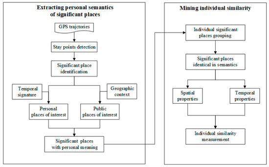Individuals have a remarkable propensity to return to their frequently visited places. Hence, the interactions between individuals and these places are likely to represent individuals’ characteristics. To facilitate the capture of these characteristics of individuals and the mining of their similarity, this study investigated how individuals spatially and temporally interact with their personally significant places. A framework was presented for mining individual similarity based on visits to personally significant places extracted from long-term trajectory data. Our framework includes two major phases: extracting the semantics of personally significant places and mining individual similarity. In contrast to many previous studies, we extracted place semantics with personal meaning, and our semantic extraction process considered individuals’ visits to both personal and public places of interest. We also proposed a new individual similarity measurement, the ISM-PSP, which incorporates both the spatio-temporal and semantic properties of individuals’ visits to significant places. Experiments using a real-world GPS dataset suggest that (1) when compared with the existing approaches, the proposed ISM-PSP is more capable of finding identical individuals, while maintaining low numbers of false identifications; (2) more accurate identification of individuals can be achieved by considering the spatio-temporal properties of visits to significant places than by considering the sequential properties; and, (3) personal places of interest play a vital role in characterizing individuals, which indicates that the semantics of visits to significant places with personal meaning are important for assessing individual similarity. Therefore, we conclude that it is insufficient to measure individual similarity by only analyzing the sequential properties of visits to public places, as done in previous works.
