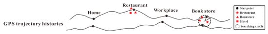 Specifically, for a set of an individual i’s significant places , the identified personal places of interest are first filtered out, and the remaining places are then regarded as public places of interest . Next, the semantics of the public places of interest are extracted by associating each of these places with a spatial context (e.g., a POI). Given the set of remaining public places of interest , for each , we compute the distance r between the center coordinates of and the farthest stay point in , and we construct a searching circle c of radius r (see Figure 3). Next, c is used to associate POIs with and to interpret the corresponding semantics. If at least one POI is contained in c, then we annotate with the category having the greatest numbers of POIs in c; otherwise, we find the nearest POI and annotate with its category. After extracting the semantics of , the temporal signatures of visits to can be used for verification.
