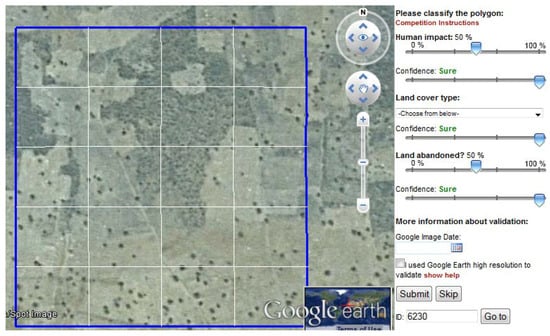 Members of the general public have for centuries made substantial contributions to science. The inputs range greatly and include the observations of environmental features by an individual and the processing of vast datasets by teams of citizens working in parallel in subjects ranging from astronomy to zoology. Technological developments such as the internet have greatly facilitated the recent strong rise in citizen science activity []. Additional technological advances, such as those that have allowed inexpensive and location-aware devices to become commonplace, have been associated with a substantial increase in citizen science activity within geography for which spatial data sets are important. This type of activity has been described in a variety of ways including neogeography, volunteered geographic information, user-generated content, and crowdsourcing []. The latter term will be used in this article. Crowdsourcing has become a popular means of acquiring geographic information. Indeed, the rise of the citizen sensor and growth of volunteered geographic information has revolutionised aspects of contemporary geoinformatics and mapping [,,,]. The power of the crowd has been harnessed in a wide range of mapping applications such as building damage mapping to aid post-disaster humanitarian aid [,] through scientific studies of the Earth [] to the provision of complete open mapping at local to global scales such as OpenStreetMap []. Crowdsourcing has greatly changed mapping practice and also allows information that was otherwise impossible or at least impractical to obtain by other means to be acquired. One growth area in geoinformatics has been crowdsourcing as a source of ground reference data on land cover to inform analyses of satellite remote sensing imagery []. This is an important and growing application area, with citizens having the potential to provide the ground reference data that are needed to fully exploit the potential of remote sensing as a source of information on land cover.
