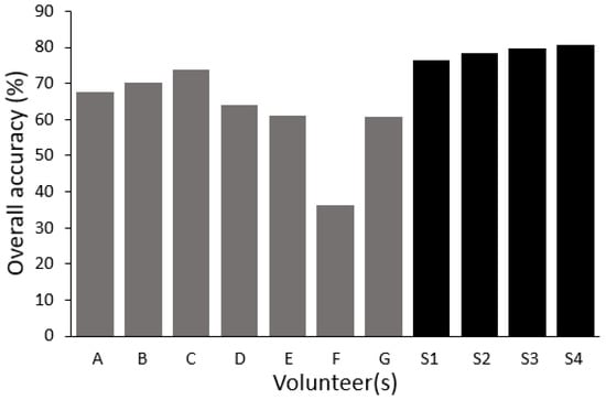 Overall classification accuracy determined relative to the reference data set for each of the individual volunteers (grey bars) and the highest accuracy from each of the four scenarios for an ensemble classification (S1–S4, black bars).