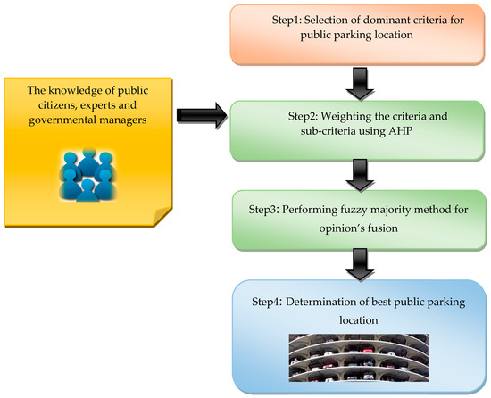 Site selection is one of the basic decisions in a public urban space that can be determined based on topographic interest, land availability, land use, and public preference [1]. The site needs to be free of any natural or environmental interference, undesirable industry, business, or traffic hazards, and it needs be accessible to present and future populations. In most communities, however, the most favorable site is elusive to find [2,3]. Traditionally, site selection relied on an expert’s knowledge, while the main users of the facilities, such as urban managers and especially public citizens, were not included [4]. Thus, the locations of selected areas do not meet user’s interests and requirements [5]. One of the most important urban facilities is public parking. Today, due to the widespread use of the automotive, almost all large cities experience public parking unavailability. In fact, one of the issues that comes up to solve the traffic problem is the right choice for public parking [6,7]. Therefore, it is necessary to study a previous approach to obtain the most advantageous site selection for public parking.