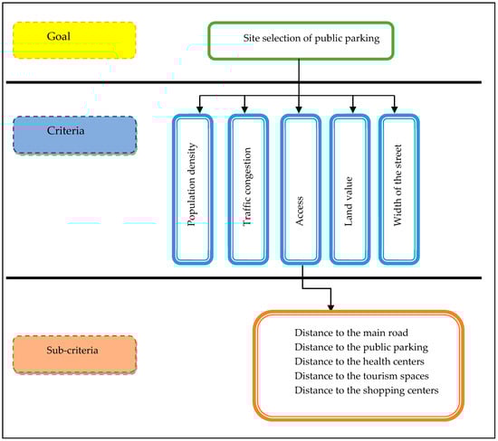 Step#1: This step is concentrated on the selection of dominant criteria, which have an effect on the determination of appropriate public parking in an urban area. To achieve this, we selected five criteria: Population density, traffic congestion, access, land value, and width of street. Among these criteria, “access” has sub-criteria, as illustrated in Figure 2.