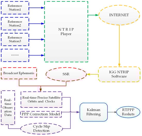 It is critical for the real-time PPP to access real-time data and SSR products in an efficient way [,,,,,]. Accessing GNSS data via the Internet based on NTRIP has been widely used in many applications. For instance, it has been adopted in data transmission between CORS (Continuously Operating Reference Stations) servers and receivers. The NTRIP agreement, which officially became an RTCM standard in November 2004, is used for sending data streams in the format of RTCM 2.0 and 3.0. Real-time orbit and clock correction data generated by ACs in IGS-RTPP are released in SSR (State Space Representation) format in compliance with the RTCM standard and broadcasted via NTRIP (RTCM 2011). Figure 1 shows the broadcasting, receiving, and precise positioning process of real-time GNSS data/products. The GNSS data transmission system based on NTRIP generally consists of four parts: the data source, server (NtripServer), broadcaster (NtripCaster), and client terminal (NtripClient). The table of data sources generated by NTRIP broadcasters contains general information about data sources including their ID, RTCM version, data type, etc. One can access this table via the Internet on a client terminal, and select proper mount points to obtain raw data or corrections from NTRIP data sources with a short latency [].