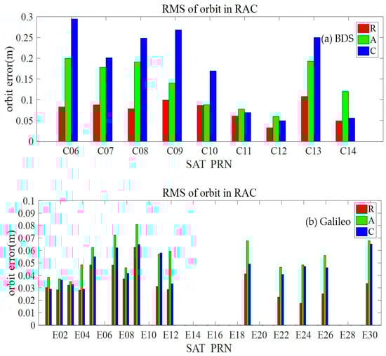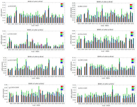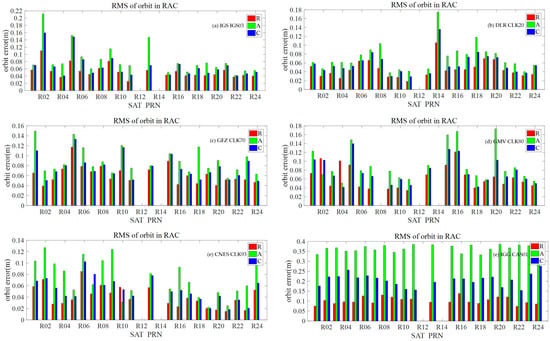 The RMS of differences between orbits calculated using real-time corrections and final products was calculated for the radial (R), along-track (A), and cross-track (C) directions in a satellite-fixed coordinate system with the equation