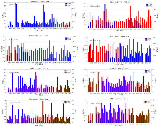 The Root Mean Square (RMS) (blue bar) and Standard Deviation (STD) (red bar) of the differences of real-time Global Positioning System (GPS) clock between the eight selected analysis centers’ (ACs’) products and the International GNSS Service (IGS) final product.