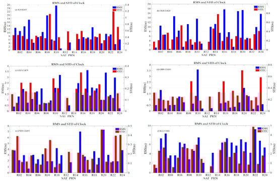The RMS (blue bar) and STD (red bar) of the differences of real-time GLONASS clock between the six selected ACs’ products and the IGS final product.