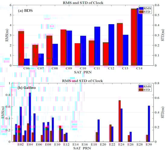 For clock comparison, the RMS and STD of the differences between the real-time clock and the reference clock are generally calculated for the assessment after unifying statistical criteria, where RMS reflects the compliance of clock correction and pseudo-range, while STD represents the real resolution precision of clock correction which has a great influence on processing phase data [,]. Meanwhile, we considered the mean of the clocks for all the satellites as zero as the datum instead of selecting a reference satellite as the datum [,], which may cause the loss of precision for the reference satellite. The adopted mathematical approach is as follows: