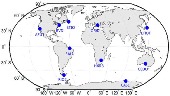 The GNSS satellite orbit and clock products are generally used for the real-time precise point positioning. In this section, we further validated the performance of real-time products by the PPP technique. The PPP software used in this experiment, named RTPosNavi_AOE (version 1.0.17a, Beijing, China), was developed by the Academy of Opto-Electronics (AOE) based on the open-source software RTKLIB (version 2.4.3, Japan) []. The PPP rover used for this validation was conducted in static and kinematic modes, respectively, but the data processing strategy was all designed as kinematic mode, i.e., the estimated parameters of rover coordinates in two neighboring epochs were considered as independent. The PPP observation model was the ionosphere-free (IF) combination of dual-frequency carrier phase and pseudo-range observations, and the Kalman filter was adopted for parameter estimation. The specific processing strategy is listed in Table 6. To evaluate the accuracy of real-time PPP, the real-time data stream in RTCM format from 10 stations from the IGS/MGEX network was selected in this study. The distribution of the selected stations for the experiment is shown in Figure 8.