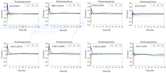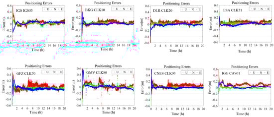 RTPosNavi_AOE receives the real-time raw data and the GNSS satellite orbit and clock products via the IGG-Ntrip software and carries out the PPP result. Taking CEDU station as an example, our experiment began at 00:00:00 (UTC) on 12 September 2017 and lasted for 20 h. IGS has released the known coordinates of every station and we directly used them as the reference for validating the positioning accuracy. The time series of the differences between the PPP-estimated and IGS-released coordinates in the E, N, and U directions are shown in Figure 10, where the results based on the different real-time GNSS satellite orbit and clock products are individually illustrated by each sub-figure. The ranges of the vertical axis of each sub-figure were set as the same for convenience during comparison, and the horizontal axis was the hour from the experiment start time. With the exception of the real-time product from IGS03 and CLK80, the convergence time was usually less than 30 min, and the positioning accuracy after finishing the convergence process was almost better than 15 cm in the E, N, and U directions.