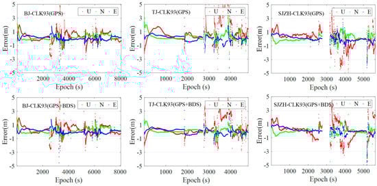 Time series of the differences between real-time PPP-estimated and post PPP at Beijing (left), Tianjin (middle), and Shijiazhuang (right) in the E, N, and U directions. The results of GPS (top) and GPS + BDS (bottom) based on the real-time products from CLK93 are only shown here.