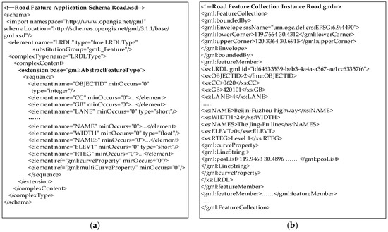 For example, Road.xsd of a road element (Figure 1a) includes a content model, wherein the structure of the road element instance, LRDL, is organized. The LRDL element type describes many spatial and non-spatial attributes. In the form of tagged pairs, these attributes define the data structure of the road element. Non-spatial attributes include the road name, identification, width, material, and so on, as well as numeric attributes (OBJECTID and WIDTH) and text attributes (MATRL and NAME). Spatial attributes directly use the pre-defined type of GML geometry schema, such as acurveProperty and multiCurveProperty. LRDLType, inherited from the element schema, illustrates the application of the road data to the element model. In the instance document, Road.gml (Figure 1b), the instance data starts from the tag FeatureCollection. The tag boundedBy describes the spatial scope of the element, and each element is organized in the form of a featureMember tag pair, forming a collection of elements that embody the nested form. Corresponding to the application schema, elements in the instance data contain all the attributes described in the application schema. Each attribute has a definite value included in attribute tags, e.g., the WIDTH value is 24, and the posList attribute value of the LingString object is the coordinate sequence.
