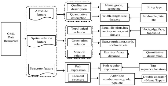 With attributes, spatial features, and structural features, GML retrieval should integrate GML feature items into an index system, where GML feature items are used as index feature items. Therefore, based on the features of GML data and retrieval requirements, we summarize the common types of retrieval modes.
