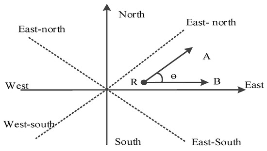 As shown in Figure 3, when calculating the direction relevance of target object A and reference object B, we can calculate the angle between vectors RA and RB. A smaller angle indicates higher similarity, and an angle of more than 90 degrees is not relevant. The same holds true for north and east–north, and so on. We only need to calculate the angle between the connecting line of the target and the reference object with the retrieval direction. This method can calculate the relevance of continuous change of different directions and significantly improve the filtering ability of the retrieval results, thereby ensuring the accuracy of the retrieval results.