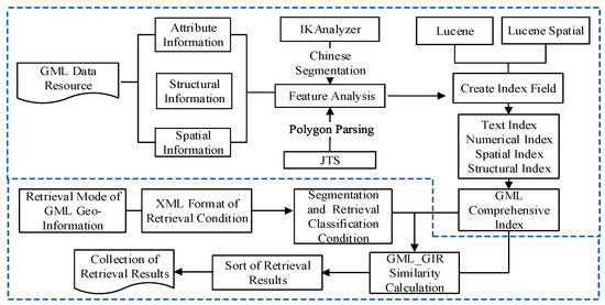 Complicated polygons (for example, polygons with holes or islands) rely on JTS to realize different objectives, such as the parsing, constructing geometry objects, computing complex spaces, and judging spatial relations. Then, the spatial index is created. For the structure index, it uses a textual index to realize construction of GML integrated indexes. The sorting of retrieval results is the key to obtain correct information. The retrieval conditions are expressed by XML formation; the retrieval feature items are extracted. Accordingly, the Lucene similarity scoring algorithm is improved. Finally, the final ranking of retrieval results is achieved by combining the similarity calculation method of the GML_GIR model.