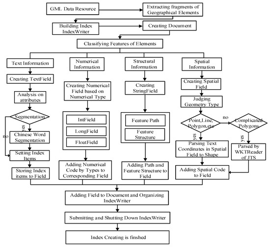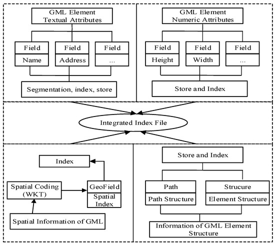 The index is the foundation for retrieval. Relying on the textual index model and spatial index components offered by Lucene, we designed an index model for GML data, as shown in Figure 5. This shows the contents of the model, such as attributes information, spatial information, and structure information. Using the Lucene index, we constructed indexes for GML element items and integrated them into the comprehensive index file. For the index construction for attributes text, such as the name, address, and other attribute fields, usually we need Chinese word segmentation and obtain textual items that are based on word units. In this paper, the textual index uses an inverted index. For numeric attributes, such as length and area, no word segmentation is required and so the indexes are directly constructed, then stored. For spatial information, first, coordinates are extracted; second, based on the forms of points, lines and areas, they are converted to the corresponding geometry; finally, with Lucene Spatial modules, spatial information is stored in index fields and spatial indexes are constructed by means of the structures and methods of the spatial module. For structural information, they are divided into label sequences for paths and element structures. In fact, they belong to the “text” type; therefore, the index construction is the same as for text.