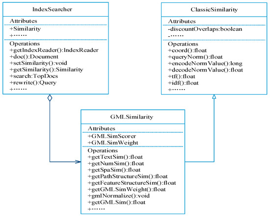 As depicted in Figure 7, GMLSimilarity is inherited from ClassicSimilarity and regarded as one attribute of IndexSearcher in the correlation calculation of the search results. Based on the original algorithm and bonding with the GML_GIR retrieval model, the text calculation method is further encapsulated and extended, thereby adding the computing methods of attribute numbers, spatial relations, and structure relations. Meanwhile, some functions—for example, normalizing correlation—are overridden in the GMLSimilarity class. The new methods are shown in Table 3.