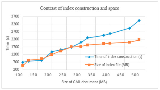 As shown in Figure 9, with the amount of GML data increasing, the index construction time and the size of the index file also increase. The time of the index construction is linearly related to the GML document size. The average 100 MB GML document required 688.93 s. Due to the time consumed in the network transmission for calling the WFS service to obtain the GML data, if the GML documents were local, much less time would be required to construct indexes for GML documents with the same amount of data. From the retrieval space, an increase in GML data has less effect on the size of the index files, which reflects the functions of compression and index optimization for the comprehensive index of Lucene with the large amount of data.