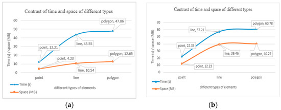 (a) Time vs. space for GML elements of different type (Example 1); (b) time vs. space for GML elements of different type (Example 2).