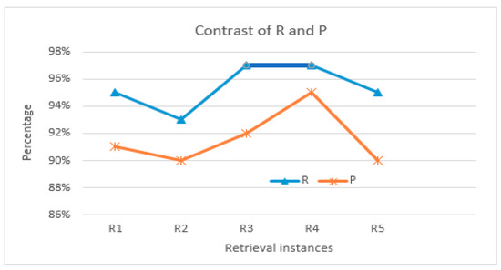 The recall and precision ratio are effective indicators for analysis of retrieval quality. The recall ratio represents the ratio of the number of relevant results to all that meet the retrieval conditions. The precision ratio represents the ratio of the number of relevant results to all that are retrieved. These formulas are defined as in Equations (16) and (17):