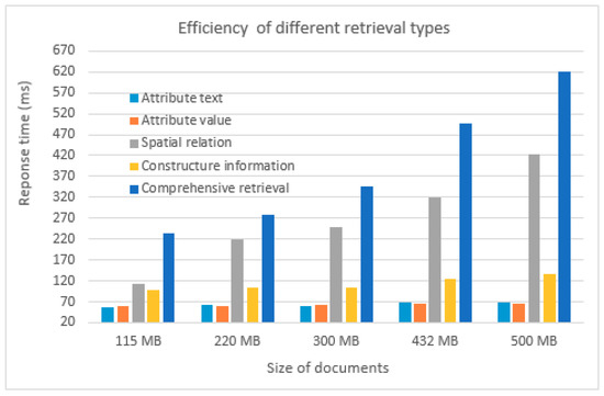 As presented in Figure 12, the efficiency of retrieving attribute text and numbers is higher than that of spatial and structural relationships with different sizes of data, which proves that the Lucene text search engine is suitable for GML data retrieval of attribute text and number. However, for spatial and structural retrieval for GML data, efficiency could be improved in terms of the index construction. The retrieval efficiency of simple features is higher than that of comprehensive retrieval, which aligns with the actual situation. With the increasing GML data and index data (especially the spatial index), it can be observed that the time for retrieving a single feature increases. Thus, the retrieval time shows a large growth trend. Nevertheless, the response time of comprehensive retrieval is less than 1 s, even for 500 MB of GML data, which can definitely meet user demand and thus shows the feasibility of comprehensive retrieval.