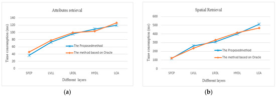 In order to verify the results of time consumption with the method based on Oracle, we selected four typical layers with rich elements that represent points, lines, and polygons (see Table 5). For each layer, attributes and spatial retrieval were selected for comparison. The average of the 10 run times is selected. As shown in Figure 13a, overall, the proposed method is better than the method based on Oracle. This indicates that the attribute relevance (see Section 3.1) is suitable for GML data. As shown in Figure 13b, for the two methods, in general, the trend line of run time is similar; however, for the LCA layer, the change is more obvious. For polygon entities, the accuracy is too low for the distance calculation with Lucene. The reason may be how long it takes to select the GeoHash string; it might be better to choose an R-tree index, just like the method based on Oracle.