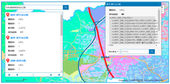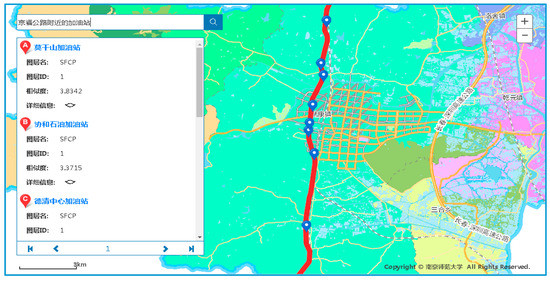 In this paper, several typical retrieval examples are selected to analyze the rich forms of geographic information retrieval methods for GML data resources. As shown in Figure 14, the red line is the Jing-Fu highway and is taken as the reference object. We entered “gas stations near the Jing-Fu highway” in the retrieval box. The default retrieval is gas stations within 1 km around the Jing-Fu highway. The retrieval results are basically distributed along the Jing-Fu route. With the retrieval of spatial relations, search results can be effectively filtered, and a large number of results which are not satisfied with spatial relations are excluded. Compared with a traditional search, the search results are more targeted, which provides a richer form of retrieval than simple, keyword-based full-text retrieval.