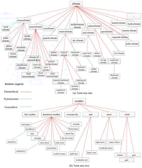 In the ISO standard, a thesaurus is defined as a “controlled and structured vocabulary in which concepts are represented by terms, organized so that relationships between concepts are made explicit, and referred terms are accompanied by lead-in entries for synonyms or quasi-synonyms” [12]. Actually, a thesaurus consists of numerous term trees. A term tree expresses one theme. In a term tree, there is a top term and other terms organized by three types of explicitly indicated relationships: (1) equivalence, (2) hierarchical and (3) associative. Equivalence relationships convey that two or more synonymous or quasi-synonymous terms label the same concept. Hierarchical relationships are established between a pair of concepts when the scope of one of them falls completely within the scope of the other. The associative relationship is used in “suggesting additional or alternative concepts for use in indexing or retrieval” and is to be applied between “semantically or conceptually” related concepts that are not hierarchically related [13,14]. For example, there are two term trees in Figure 1 whose top terms are “climate” and “weather” respectively. Terms are linked by three types of relationships; hierarchical relations are the main kind. A thesaurus is a sophisticated formalization of knowledge and there are several hundreds of thesauri in the world currently [13]. It has been used for decades for information retrieval and other purposes [13]. A thesaurus has also been used to retrieve information in GIScience [15], although the relationships it contains have not yet been analyzed quantitatively.