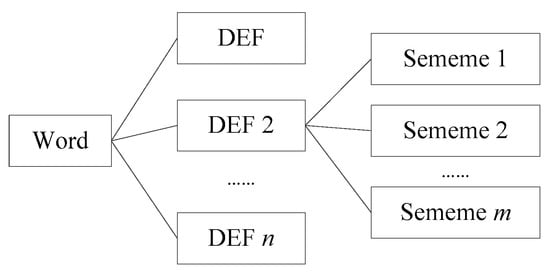 WordNet was a large generic lexical database of English which was devised by psychologists, linguists, and computer engineers from Princeton University [17]. In WordNet, nouns, verbs, adjectives and adverbs are grouped into sets of cognitive synonyms (synsets), each expressing a distinct concept. Synsets are interlinked by means of conceptual-semantic and lexical relations. In WordNet 3.0, there are 147,278 concept nodes in which 70% are nouns. There are a variety of semantic relations in WordNet, such as synonymy, antonymy, hypernymy, hyponymy and meronymy. The most common relations are hypernymy and hyponymy [18]. WordNet is an excellent lexicon to conduct word similarity computation. The main similarity measures for WordNet include edge counting-based methods [1], information theory-based methods [19], Jiang and Conrath’s methods [20], Lin’s methods [21], Leacock and Chodorow’s methods [22], Wu and Palmer’s methods [23], and Patwardhan and Pedersen’s vector and vectorp methods [24]. These measures obtain varying plausibility depending on the context and can be combined into ensembles to obtain higher plausibility [25]. WordNet is created by linguists, and it includes most of the commonly used concepts. Nevertheless, it does not cover most of the terminologies in a specific discipline. For example, in geography, the terminologies of “phenology”, “foredune”, “regionalization”, “semi-arid climate”, “periglacial landform”, and so on are not recorded in the WordNet database. Thus, when we want to tackle issues where semantic relatedness matters in a concrete domain, that is, in geography, WordNet fails. HowNet is a generic lexical database in Chinese and English. It was created by Zhendong Dong [26]. HowNet uses a markup language called KDML to describe the concept of words which facilitate computer processing [27]. There are more than 173,000 words in HowNet which are described by bilingual concept definition (DEF for short). A different semantic of one word has a different DEF description. A DEF is defined by a number of sememes and the descriptions of semantic relations between words. It is worth mentioning that a sememe is the most basic and the smallest unit which cannot be easily divided [28], and the sememes are extracted from about 6000 Chinese characters [29]. One word description in HowNet is shown in Figure 2.