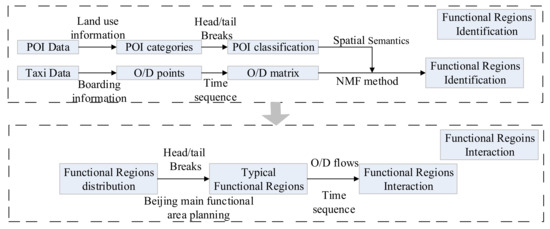 In summary, POI data and taxi trajectory data can be applied in evaluating and analyzing urban functional regions from the perspective of urban planning. The spatial distribution and geographic knowledge of POI categories can be employed as spatial semantics to annotate functional regions [24,29]. However, few studies have simultaneously considered both spatial semantics and spatial interactions to identify urban functional regions. Moreover, spatial interactions should be processed quantitatively to improve the identification of urban functional regions. In this study, we present a framework to identify urban functional regions by incorporating spatial semantics and interactions.