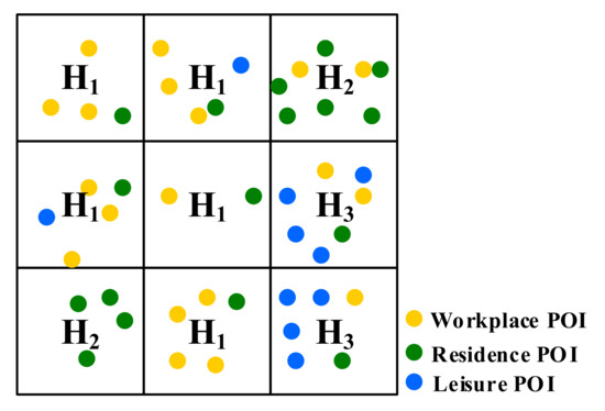 Assuming that all of the POI categories are known and given by C1, C2, C3, …, CN, we can calculate the point density of each category of POI for all M2 grids. For example, in Figure 2, H1, H2 and H3 represent the three types of functional regions in the study area, while CW, CR, and CL represent three POI categories: 19 Workspace POI, 17 Residence POI and 10 Leisure POI. Each grid is designated as a type of urban function, which results in five grids in H1, two grids in H2 and two grids in H3. After this, we calculated the point density of the POI categories of CW, CR and CL for the H1, H2 and H3.