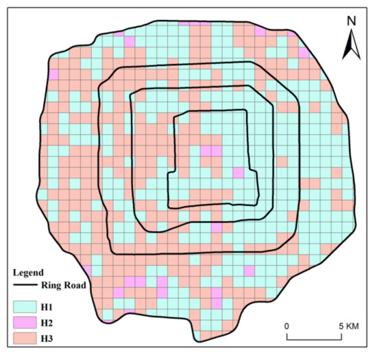 When K = 3 in Equation (5), we ascertained the three types of functional regions. As shown in Figure 5, there were 370 (51%) H1 grids, 23 (3%) H2 grids and 332 (46%) H3 grids. The point densities for different POI categories are shown in Table 3.
