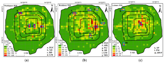 The spatial distribution of functional regions according to spatial semantics based on POI point density: (a) Workspace POI; (b) Residence POI; and (c) Leisure POI represent the functional regions for H1 (Workplace POI), H2 (Residence POI) and H3 (Leisure POI), respectively.