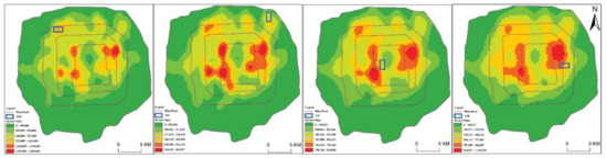The spatial distribution of functional regions’ interactions can be reflected by trip length distributions. The taxi O/D points within the four typical functional regions of ZGC, XD, GM and WJ were calculated, before the hotspot maps were generated using kernel density estimation (KDE). For example, the taxi O/D points of ZGC include both O points (the origin points of people, who get off at ZGC) and D points (the destinations of people, who get on at ZGC). Figure 7 shows the intensities and ranges of interactions among the four functional regions based on taxi O/D point density.