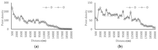 To further explore the trip length distributions in the functional regions, we used the four functional regions as the centre, before 500-m intervals were designed to generate concentric circular buffers within the study area. The calculation of the number of taxi O/D points located in each buffer area revealed the spatial distribution of the traffic attraction of the four functional regions. As shown in Figure 8, the curve of the taxi O/D point density, created by the attraction of three business-oriented functional regions, gradually decays within a 15-km distance. This finding is consistent with people’s psychologically affordable travel time and the spatial distance when they take taxi trips.