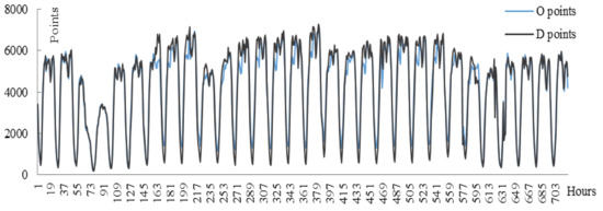 To quantitatively analyse the interactions between functional regions, we explored the temporal features of these interactions based on the method described in Section 3.2. We first divided 30 days into 720 h by one-hour intervals and counted the number of O/D points per hour to analyse the time variations of taxi O/D points in functional regions. We found that the distribution curves of the O/D points display reproducible temporal patterns and clearly follow a daily cycle for 30 one-day periods (Figure 9).