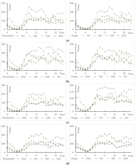 Furthermore, we set the average values of the functional regions as the threshold value. A greater than average value indicates that one functional region has a strong attraction to another functional region. In general, XD has a strong attraction to the other three functional regions, while GM has a strong attraction to itself. When residents took taxis in ZGC during the period of 08:00–16:00, GM was the main destination. From 06:00 to 09:00, WJ attracted more taxi O/D points from ZGC, XD and GM. In the period of 17:00 to 23:00, WJ was the main destination for the residents, who took a taxi from ZGC, XD and GM, which reflects the daily commute of residents in WJ to some extent. Meanwhile, the interaction intensity between WJ and GM was greater than the interaction intensity between WJ and the other functional regions, which is consistent with the pattern of distance decay in the spatial interactions. There were strongly interconnected activities linking the two business-oriented districts, XD and GM. In general, the total taxi O/D points of the two business-oriented districts increased during 08:00 to 14:00 and reached their highest peak at 12:00. After 18:00, the attracting O/D points of the two business-oriented districts continued to rise, reaching a new peak at 22:00. This is consistent with the spatiotemporal behaviours of residents when shopping and engaging in other activities at business centres.