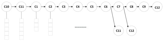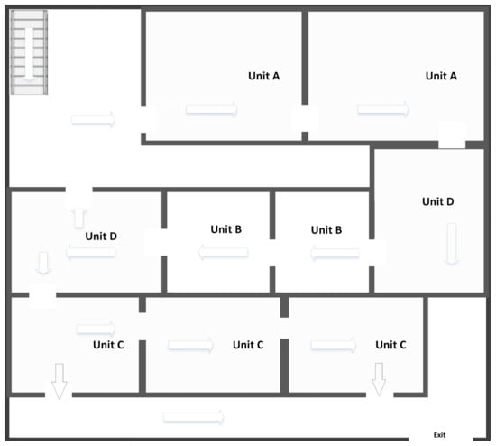 Figure 6a shows the 2D indoor structure of a museum and the direction in which moving objects are required to move. Note that if a corridor is not too long, we can model it as one cell. Otherwise, it is possible to divide it into several cells for the logical model. This is done manually, based on the judgment of the modeler. Note that the stairs are treated similarly; therefore, they can be mapped to a single cell or multiple cells as needed. Moreover, the elevator is mapped to a single cell. Note that floors and buildings can vary.